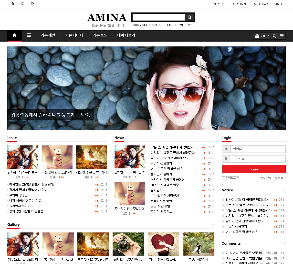※ 부트스트랩3 기반에 반응형/비반응형 통합 레이아웃으로 데모사이트( http://amina.co.kr/demo/?pv=Basic )의 좌측상단에 있는 Switcher에서 반응형/비반응형에 따른 레이아웃 설정 및 위젯설정 등을 미리보기하실 수 있습니다.