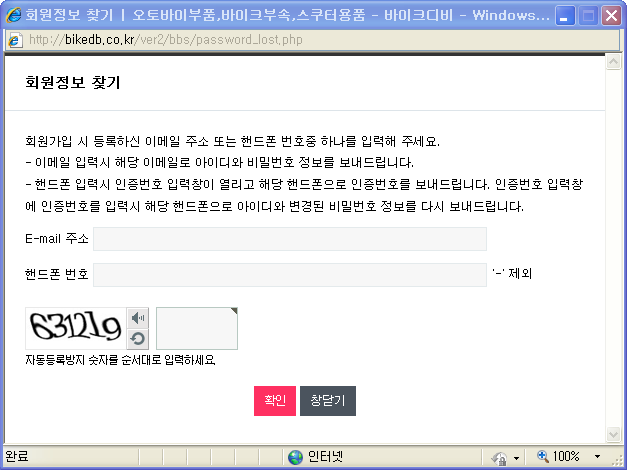 핸드폰번호로 비밀번호 찾기를 하면 그림과 같이 창이 열리고 문자는 안옵니다....ㅠㅠ